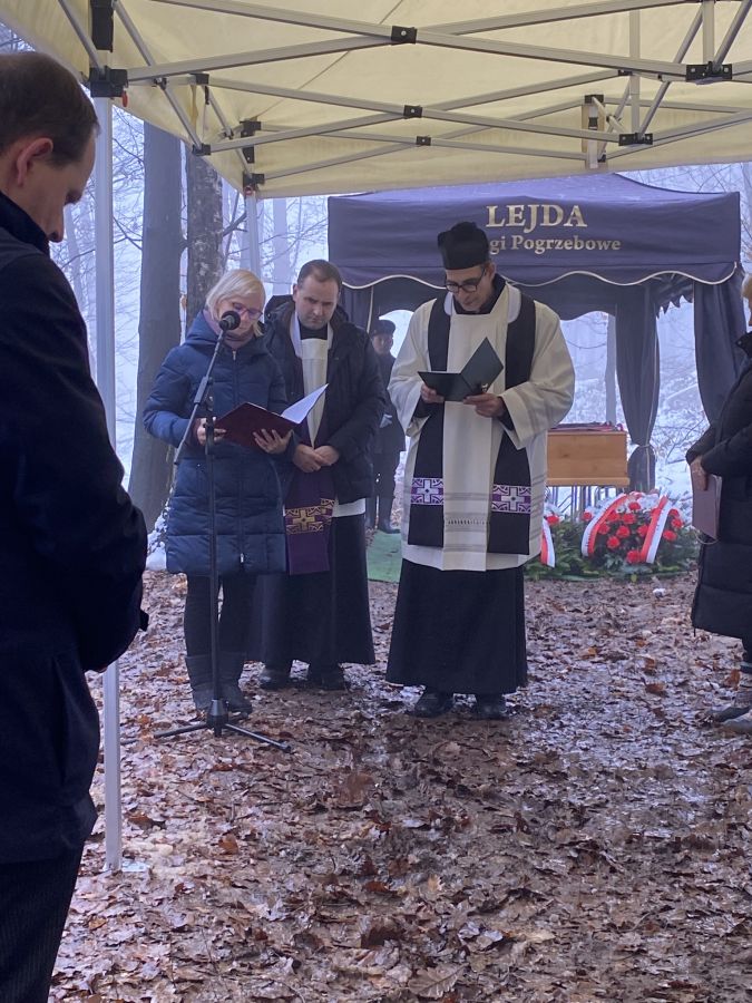 A magyar-lengyel összefogással elkészült új erdei sírkertben a himnuszok után beszédet mondott dr. Gerencsér Tibor, Magyarország krakkói főkonzulja, valamint Marek Jamborski, a Goszczát is magába foglaló Kocmyrzów-Luborzyca járás polgármestere.