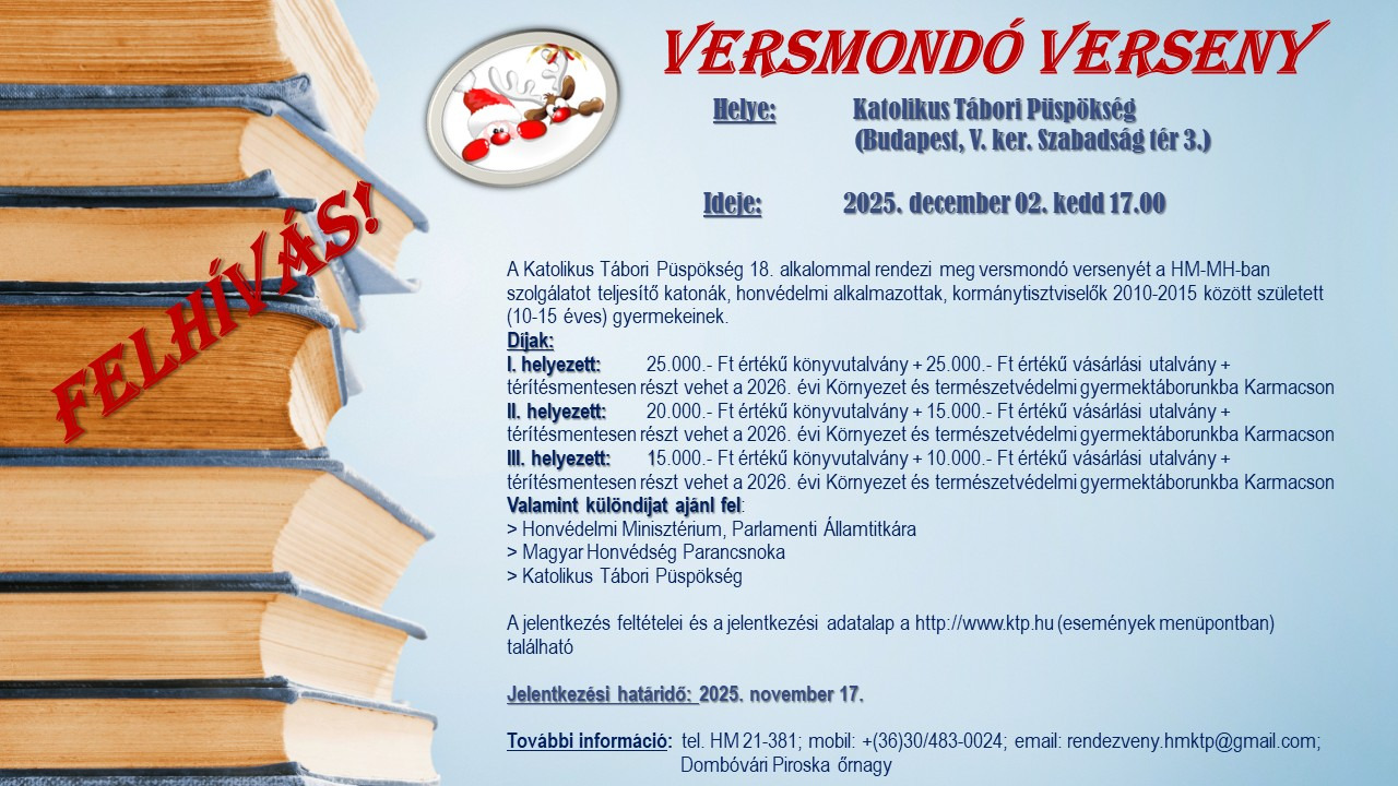 A HM Katolikus Tábori Püspökség 18. alkalommal hirdet versmondó versenyt a HM-MH-ban szolgálatot teljesítő katonák, honvédelmi alkalmazottak, kormánytisztviselők 10-15 éves (2010-2015-ben született) gyermekeinek.